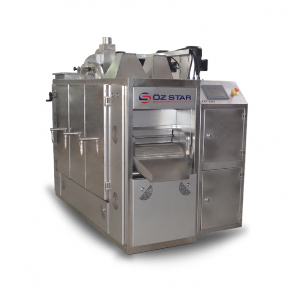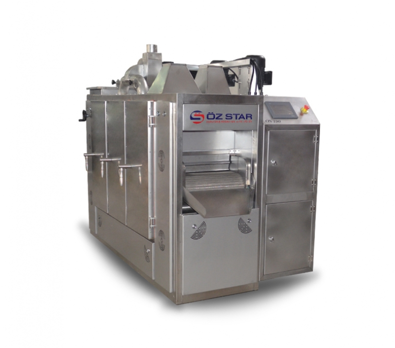 OS - 190 kuruyemiş kavurma makinası Avrupa Standartlarına uygun hafif endüstriyel uygulamalar için tek kademeli brülör ile çalışan kuruyemiş pişirme makinesidir.Kapladığı alan bakımından küçük ancak verdiği performans ile etkili üretim sağlayan iki kavurma ve tek soğutma hazneli bir elektirikli kuruyemiş pişirme fırınıdır.Bu bantlı kuruyemiş kavurma makinesi fosil yakıtlarla LPG,CNG ve DİESEL veya elektrikle çalıştıralabilir.Gaz brülörlerindeki gaz hiçbir şekilde kavrulan kuruyemişe temas etmez. Gelişmiş dokunmatik ekranlı kontrol paneli; kavurma haznelerindeki istenen sıcaklığı nemi konveyör hızını ayarlama esnekliği sunar.Bu elektrikli fırın isteğe bağlı olarak çalışan kendi kendini temizleme sistemine sahiptir.Gürültü emisyonlarını ve ısı dağılımını azaltmak için makina gelişmiş seramik elyaflardan izole edilmiştir.
