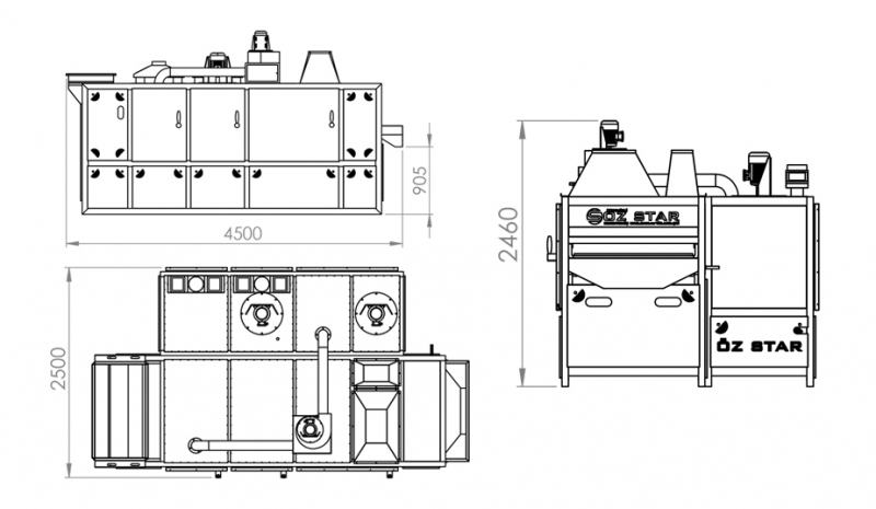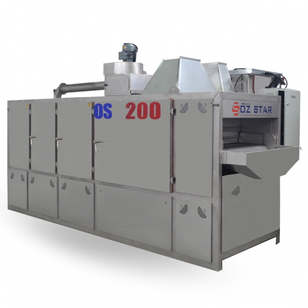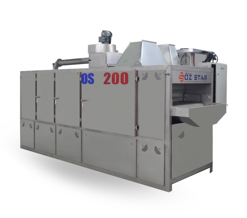 OS - 200 paletli kavurma makinası, düşük NOX emisyonuna sahip 2 adet yüksek performanslı çift kademeli brülörlerle donatılmıştır. Kullanıcı ürün tariflerini tekrar sisteme girme ihtiyacı duymadan direk olarak hafızasından seçerek işlemi başlatabilir. Bu elektrikli kuruyemiş kavurma fırını 2 kademeli gaz brülörleri ile güçlendirilmiştir. Makineye eklenmiş olan bu 2 kademeli gaz brülörleri sayesinde makine fındık, fıstık, ay çekirdeği, kabak çekirdeği, kabuklu fıstık, kabuklu fındık, badem, kabuklu badem, antep fıstığı, iç antep fıstığı ve kaju gibi neredeyse bütün kuruyemiş çeşitlerini etkili bir şekilde kavurabilmektedir.Makini ısı kaybının önlemek ve gürültüyü azaltmak için geleneksel yöntemler yerine yüksek kaliteli seramik elyaflar ile yalıtılmıştır.Bu kuruyemiş pişirme fırınının avantajtajları arasında akıllı arıza teşhis sistemi, kendi kendini temizleme sitemi, güvenilir elektronikler ve kontrol sistemleri, 200 e kadar tarifi hafızasında tutabilme özelliği ve eşsiz kavurma sistemi ile kullanıcılara oldukça kolaylık sağlar.