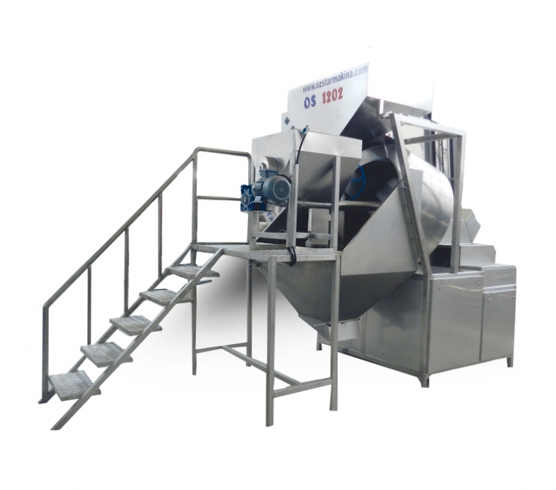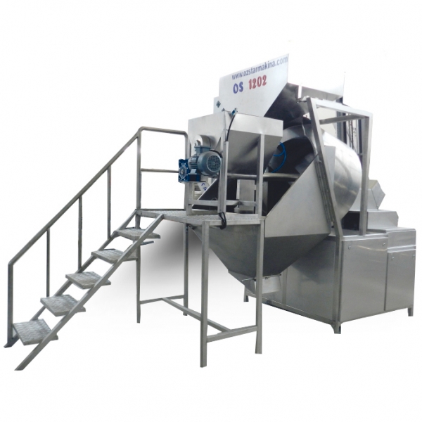 Bu tam otomatik tuzlama makinası ay çekirdeği, fıstık, kabuklu fıstık,fındık,kabuklu fındık, kabak çekirdeği,badem, kabuklu badem,antep fıstığı, kaju,sarı leblebi gibi hemen hemen bütün kuruyemişleri tuzlamak için tasarlanmıştır.Bu tuzlama makinesi tamamen AISI 304 paslanmaz çelikten imal edilmiştir.Operatör dokunmatik ekran üzerinden ürün dozu,tuz çözelti tedarik süresi,tuz çözeltisi miktarı, karıştırıcı dönme hızı gibi çeşitli paremetreleri kontrol edebilir.Kuru tuz bir spiral konveyör kullanarak taşınır.Spiral konveyörü sadece tuzlama işlemi için değil farklı soslama işlemleri için de kullanabilirsiniz.Bu tuzlama makinasında tuzlu su çözeltisi için iki tank bulunur. Bu tanklardan biri, tuzlu su çözeltisini hazırlamak için diğeri ise önceden hazırlanmış tuzlu su çözeltisini sağlamak içindir.Tuzlanan ya da soslanan ürün, kazan dönüş yönünün tersine çevirerek veya tuzlama makinesinin çıkış hunisinden toplanabilir.Tuzlanan ya da soslanan ürün bir sonraki işlem aşamasına transfer etmek için elevatöre bağlanabilir bir titreşimli ünite ilave edilebilir.Tuzlama kazanı, kullanıcının üretimini sağladıktan sonra veya gerekli görülen şekilde atıkları boşaltmasını sağlayan elle erişilebilir bir tahliye noktasına sahiptir.